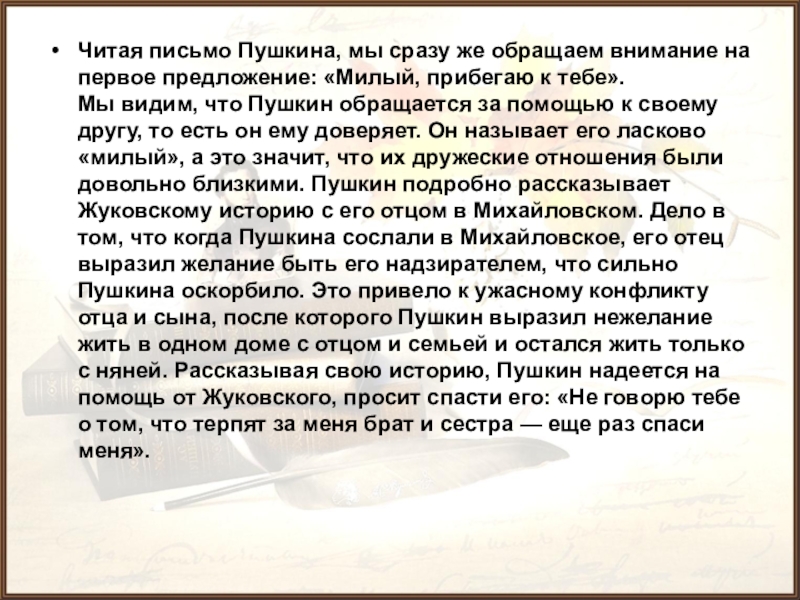 Мы видим, что Пушкин обращается за помощью к своему другу, то есть он ему доверяет. Он называет его ласково «милый», а это значит, что их дружеские отношения были довольно близкими. Пушкин подробно рассказывает Жуковскому историю с его отцом в Михайловском. Дело в том, что когда Пушкина сослали в Михайловское, его отец выразил желание быть его надзирателем, что сильно Пушкина оскорбило. Это привело к ужасному конфликту отца и сына, после которого Пушкин выразил нежелание жить в одном доме с отцом и семьей и остался жить только с няней. Рассказывая свою историю, Пушкин надеется на помощь от Жуковского, просит спасти его: «Не говорю тебе о том, что терпят за меня брат и сестра — еще раз спаси меня».