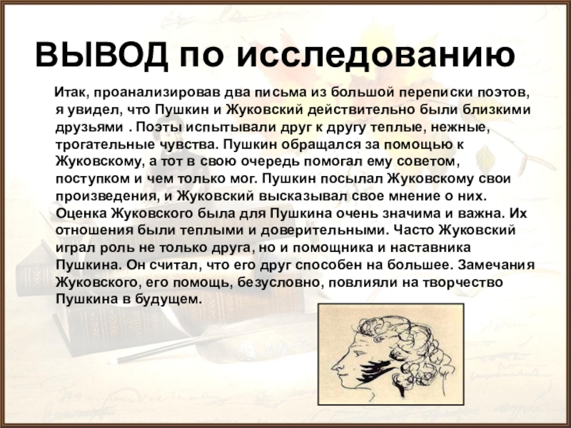 переписки поэтов, я увидел, что Пушкин и Жуковский действительно были близкими друзьями . Поэты испытывали друг к другу теплые, нежные, трогательные чувства. Пушкин обращался за помощью к Жуковскому, а тот в свою очередь помогал ему советом, поступком и чем только мог. Пушкин посылал Жуковскому свои произведения, и Жуковский высказывал свое мнение о них. Оценка Жуковского была для Пушкина очень значима и важна. Их отношения были теплыми и доверительными. Часто Жуковский играл роль не только друга, но и помощника и наставника Пушкина. Он считал, что его друг способен на большее. Замечания Жуковского, его помощь, безусловно, повлияли на творчество Пушкина в будущем.