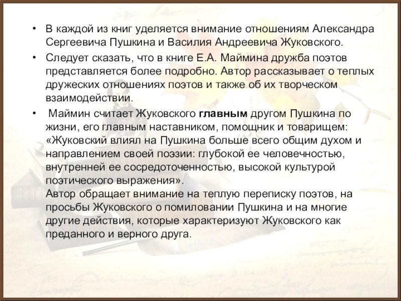Маймин считает Жуковского главным другом Пушкина по жизни, его главным наставником, помощник и товарищем: «Жуковский влиял на Пушкина больше всего общим духом и направлением своей поэзии: глубокой ее человечностью, внутренней ее сосредоточенностью, высокой культурой поэтического выражения».