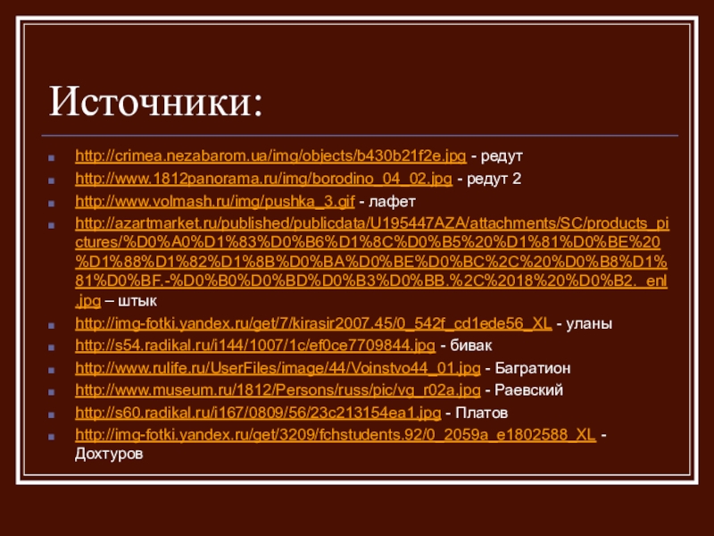 Источники:http://crimea.nezabarom.ua/img/objects/b430b21f2e.jpg - редутhttp://www.1812panorama.ru/img/borodino_04_02.jpg - редут 2http://www.volmash.ru/img/pushka_3.gif - лафетhttp://azartmarket.ru/published/publicdata/U195447AZA/attachments/SC/products_pictures/%D0%A0%D1%83%D0%B6%D1%8C%D0%B5%20%D1%81%D0%BE%20%D1%88%D1%82%D1%8B%D0%BA%D0%BE%D0%BC%2C%20%D0%B8%D1%81%D0%BF.-%D0%B0%D0%BD%D0%B3%D0%BB.%2C%2018%20%D0%B2._enl.jpg – штыкhttp://img-fotki.yandex.ru/get/7/kirasir2007.45/0_542f_cd1ede56_XL - уланыhttp://s54.radikal.ru/i144/1007/1c/ef0ce7709844.jpg - бивакhttp://www.rulife.ru/UserFiles/image/44/Voinstvo44_01.jpg - Багратионhttp://www.museum.ru/1812/Persons/russ/pic/vg_r02a.jpg -