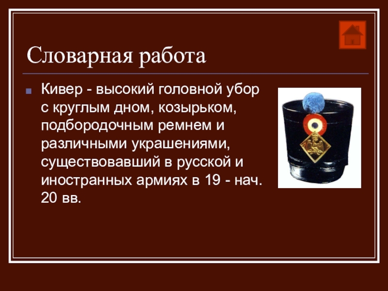Словарная работаКивер - высокий головной убор с круглым дном, козырьком, подбородочным ремнем и различными украшениями, существовавший в