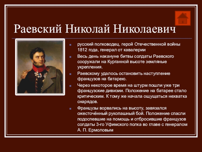 Раевский Николай Николаевичрусский полководец, герой Отечественной войны 1812 года, генерал от кавалерииВесь день накануне битвы солдаты Раевского