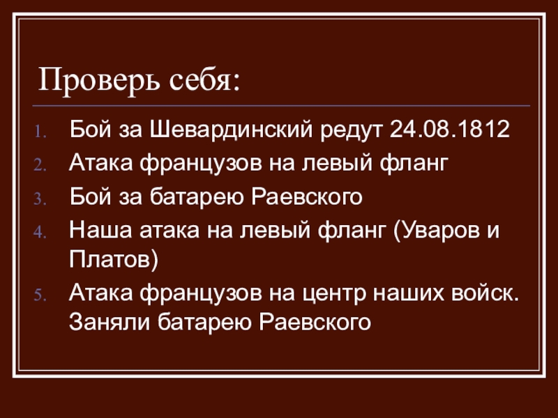 Проверь себя:Бой за Шевардинский редут 24.08.1812Атака французов на левый флангБой за батарею РаевскогоНаша атака на левый фланг