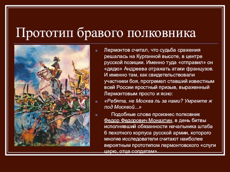 Подобные слова произнес полковник Федор Федорович Монахтин, в день битвы исполнявший обязанности начальника штаба 6 пехотного корпуса русской армии, которого многие исследователи считают наиболее вероятным прототипом лермонтовского «слуги царю, отца солдатам».