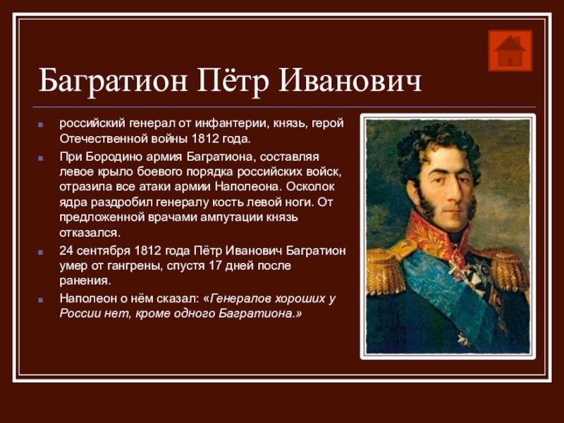 Наполеон о нём сказал: «Генералов хороших у России нет, кроме одного Багратиона.»
