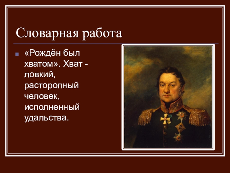 Словарная работа«Рождён был хватом». Хват - ловкий, расторопный человек, исполненный удальства.