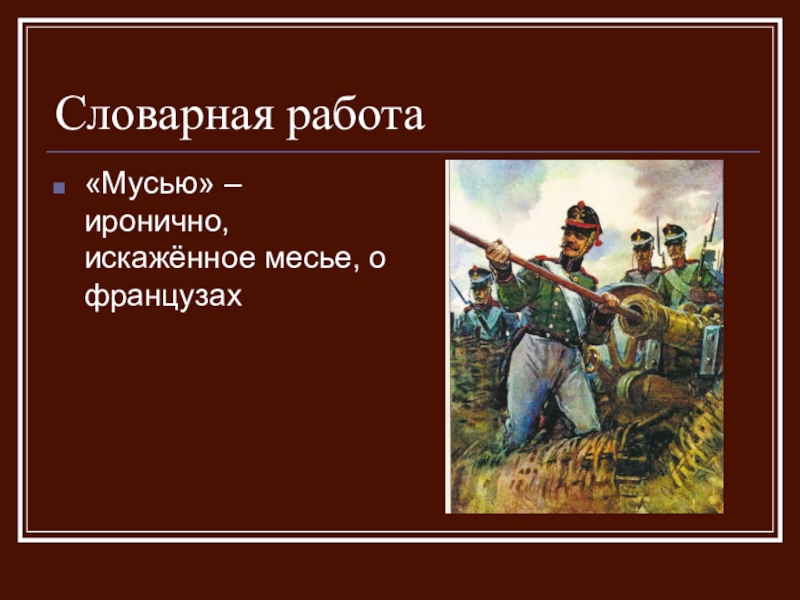 Словарная работа«Мусью» – иронично, искажённое месье, о французах