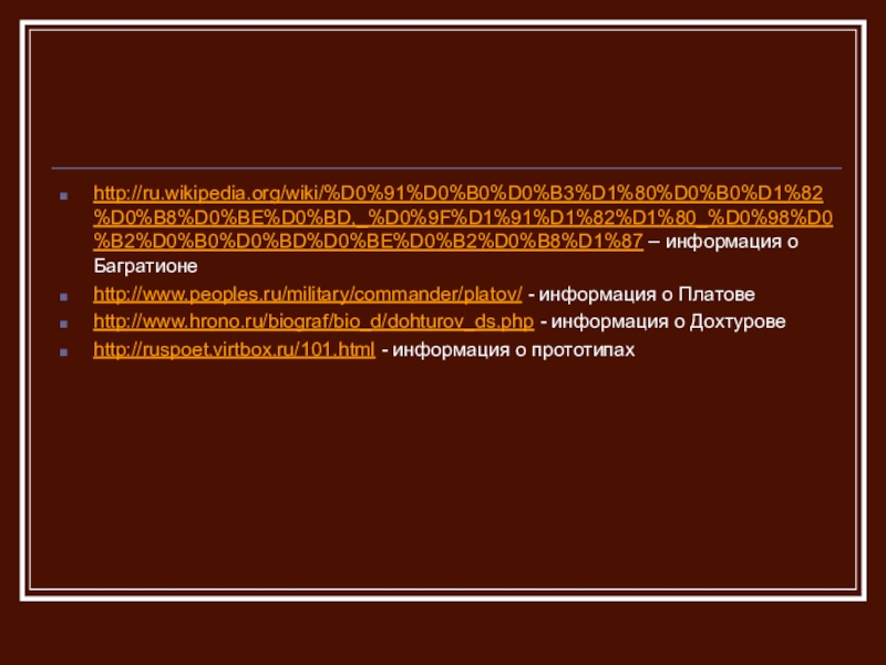 http://ru.wikipedia.org/wiki/%D0%91%D0%B0%D0%B3%D1%80%D0%B0%D1%82%D0%B8%D0%BE%D0%BD,_%D0%9F%D1%91%D1%82%D1%80_%D0%98%D0%B2%D0%B0%D0%BD%D0%BE%D0%B2%D0%B8%D1%87 – информация о Багратионеhttp://www.peoples.ru/military/commander/platov/ - информация о Платовеhttp://www.hrono.ru/biograf/bio_d/dohturov_ds.php - информация о Дохтуровеhttp://ruspoet.virtbox.ru/101.html - информация о прототипах