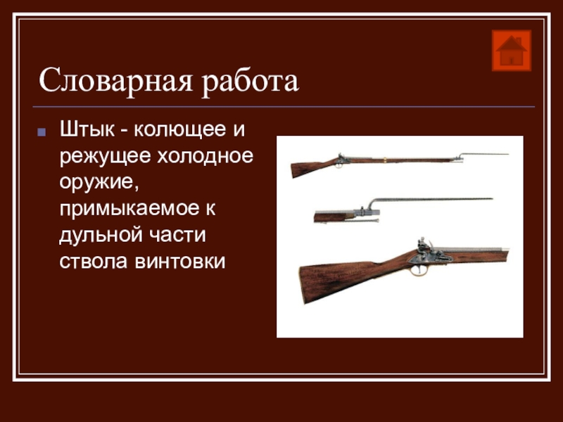 Словарная работаШтык - колющее и режущее холодное оружие, примыкаемое к дульной части ствола винтовки