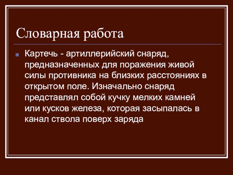 Словарная работаКартечь - артиллерийский снаряд, предназначенных для поражения живой силы противника на близких расстояниях в открытом поле.