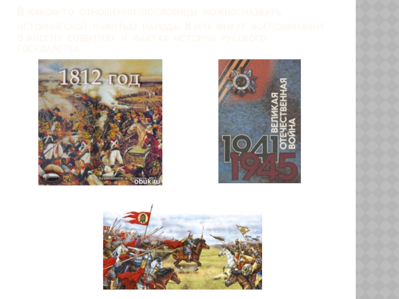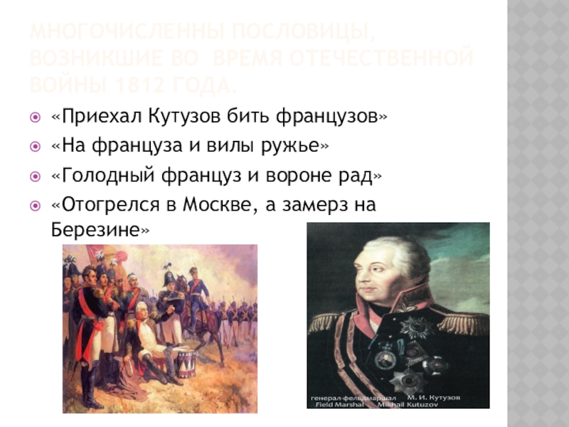 Слайд 15Многочисленны пословицы, возникшие во время отечественной войны 1812 года.