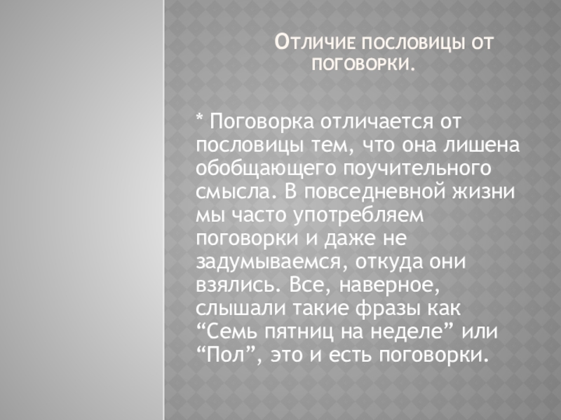 отличается от пословицы тем, что она лишена обобщающего поучительного смысла. В повседневной жизни мы часто употребляем поговорки и даже не задумываемся, откуда они взялись. Все, наверное, слышали такие фразы как “Семь пятниц на неделе” или “Пол”, это и есть поговорки.