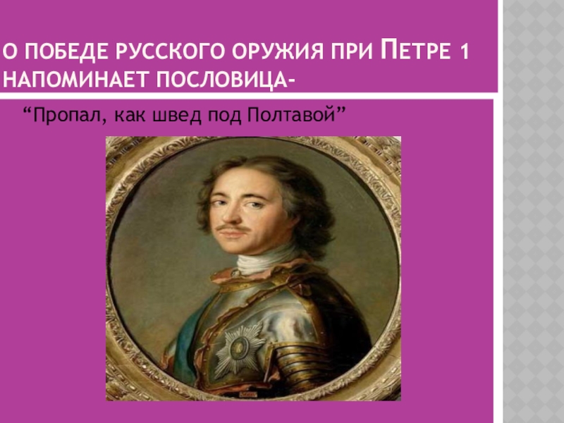 Слайд 14О победе русского оружия при петре 1 напоминает пословица-