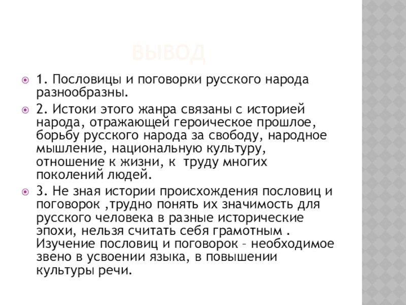 3. Не зная истории происхождения пословиц и поговорок ,трудно понять их значимость для русского человека в разные исторические эпохи, нельзя считать себя грамотным . Изучение пословиц и поговорок – необходимое звено в усвоении языка, в повышении культуры речи.