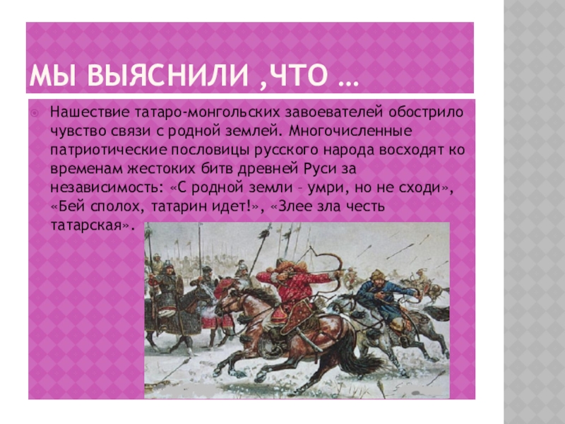 с родной землей. Многочисленные патриотические пословицы русского народа восходят ко временам жестоких битв древней Руси за независимость: «С родной земли – умри, но не сходи», «Бей сполох, татарин идет!», «Злее зла честь татарская».