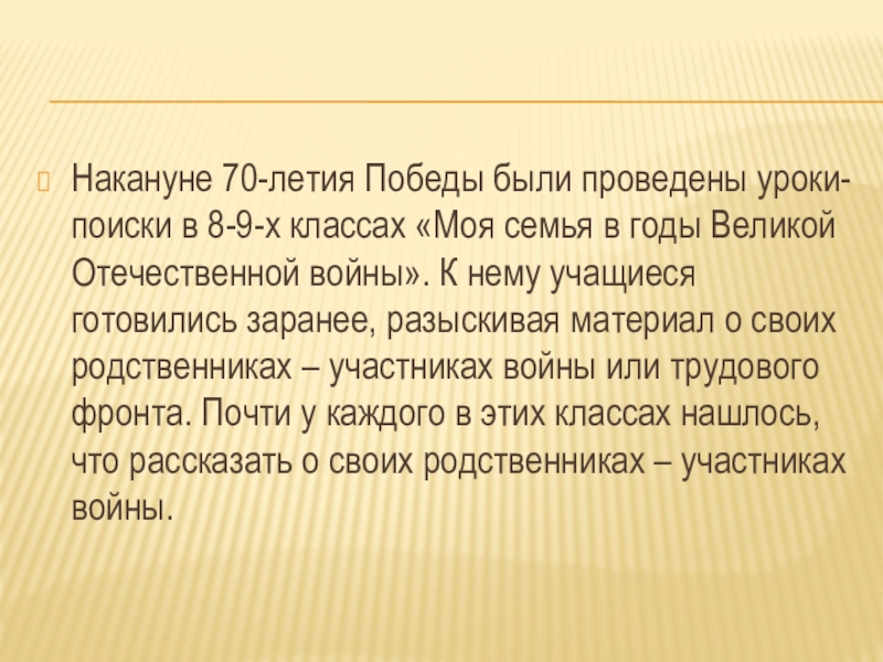 Слайд 9Накануне 70-летия Победы были проведены уроки-поиски в 8-9-х классах «Моя семья