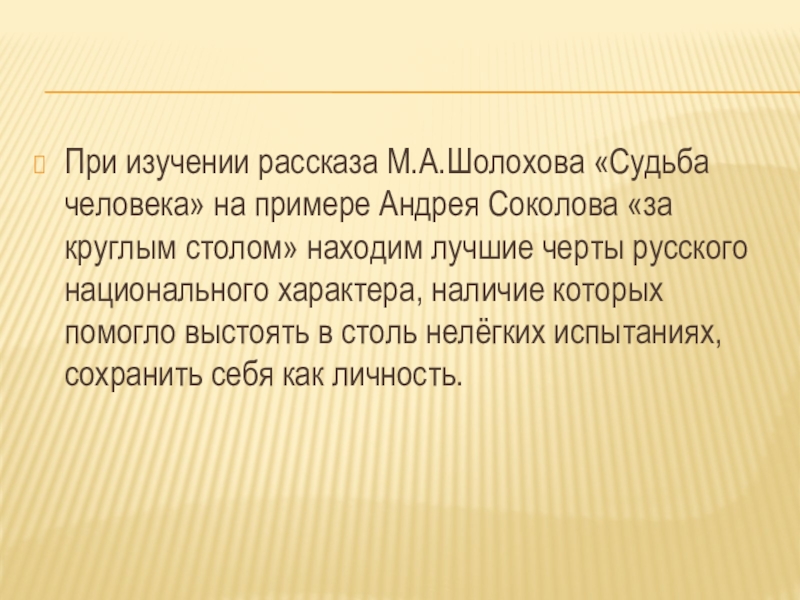 Слайд 8При изучении рассказа М.А.Шолохова «Судьба человека» на примере Андрея Соколова «за