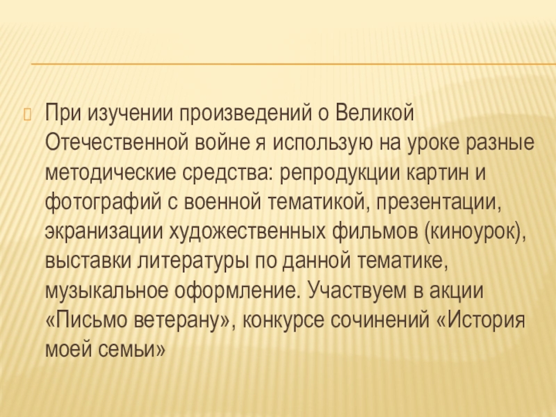на уроке разные методические средства: репродукции картин и фотографий с военной тематикой, презентации, экранизации художественных фильмов (киноурок), выставки литературы по данной тематике, музыкальное оформление. Участвуем в акции «Письмо ветерану», конкурсе сочинений «История моей семьи»