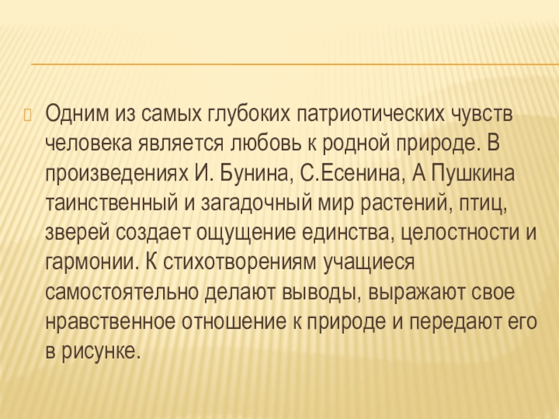 природе. В произведениях И. Бунина, С.Есенина, А Пушкина таинственный и загадочный мир растений, птиц, зверей создает ощущение единства, целостности и гармонии. К стихотворениям учащиеся самостоятельно делают выводы, выражают свое нравственное отношение к природе и передают его в рисунке.