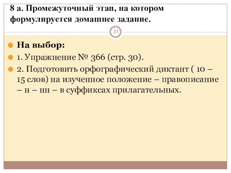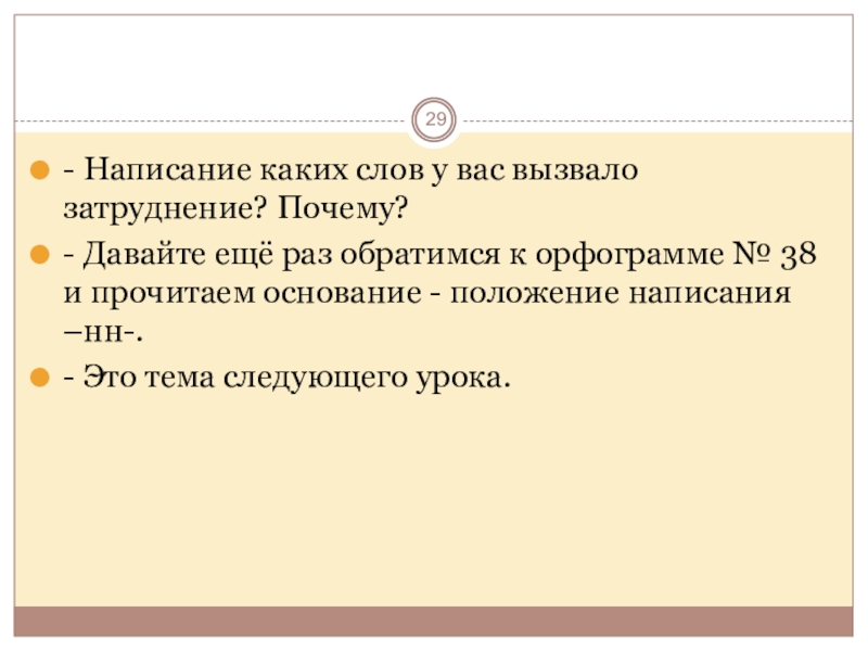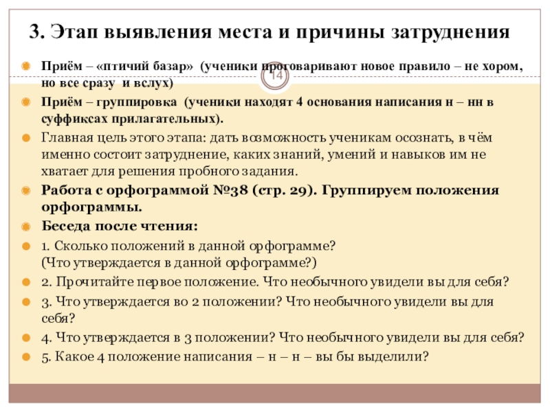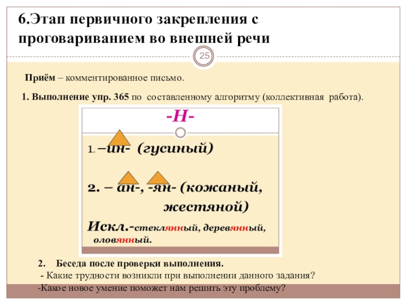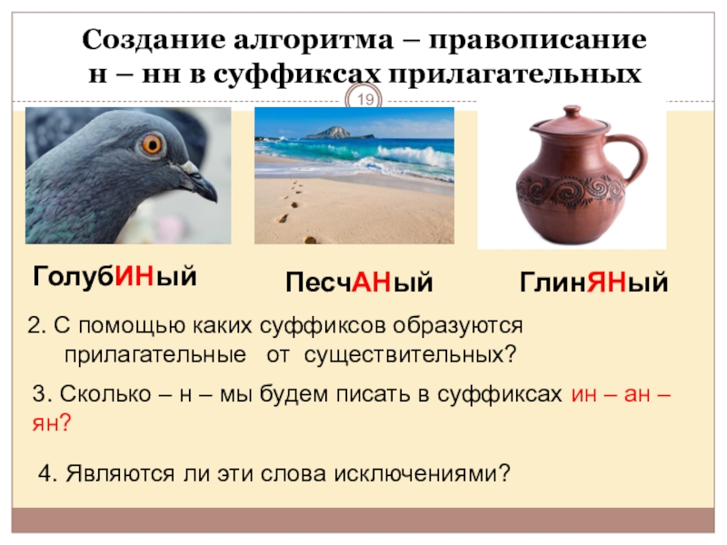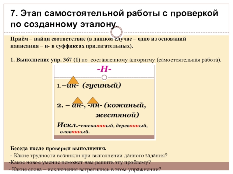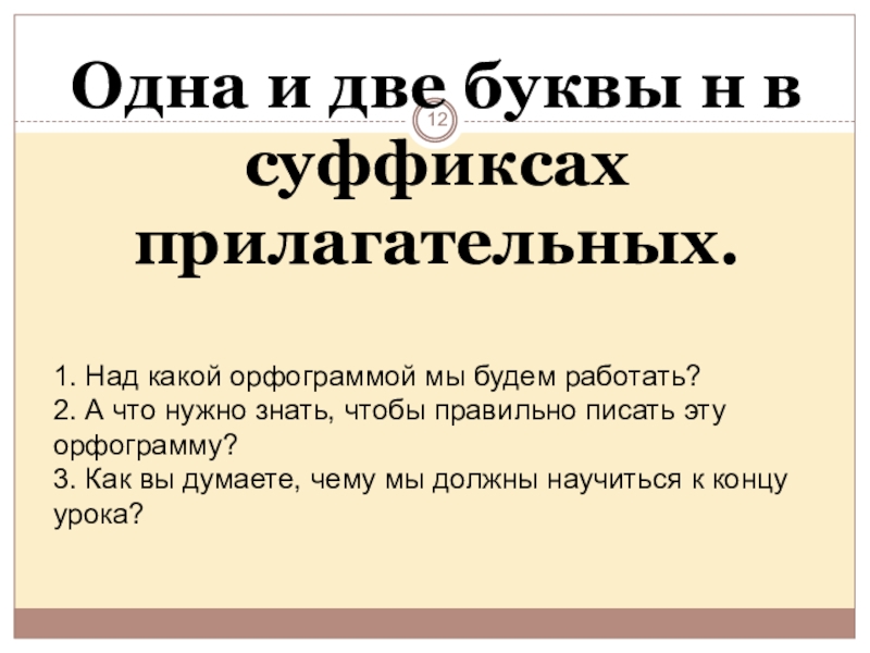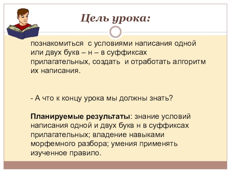 На данном уроке – коллективное решение возникшей проблемы, которая поможет решить учебную задачу и зафиксировать её в эталоне: алгоритме выбора – н –нн в суффиксах прилагательных.