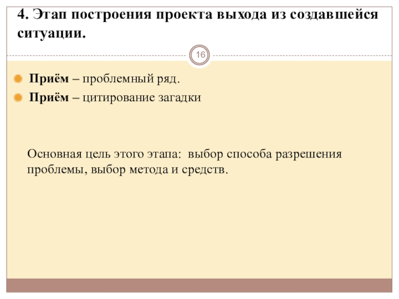 Основная цель этого этапа: выбор способа разрешения проблемы, выбор метода и средств.