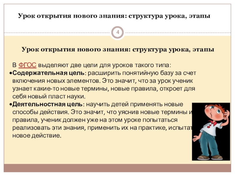 Деятельностная цель: научить детей применять новые способы действия. Это значит, что уяснив новые термины и правила, ученик должен уже на этом уроке попытаться реализовать эти знания, применить их на практике, испытать новое действие.