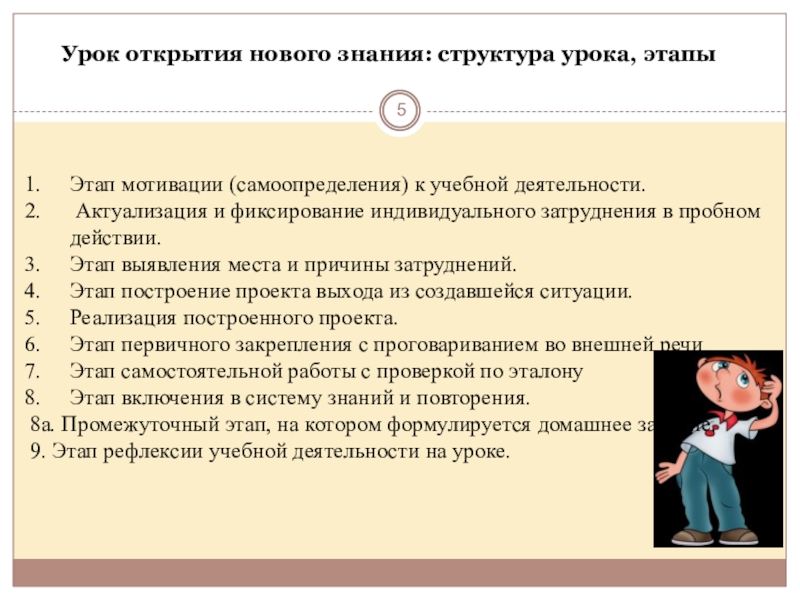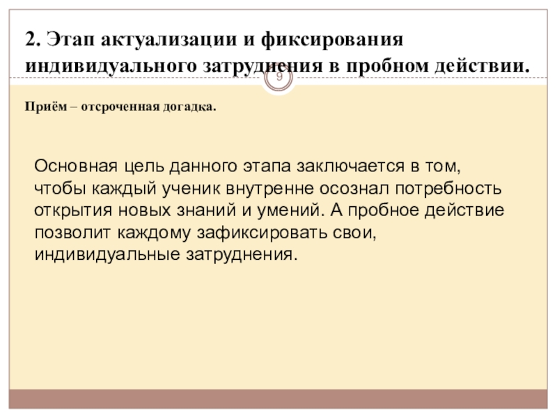 Основная цель данного этапа заключается в том, чтобы каждый ученик внутренне осознал потребность открытия новых знаний и умений. А пробное действие позволит каждому зафиксировать свои, индивидуальные затруднения.