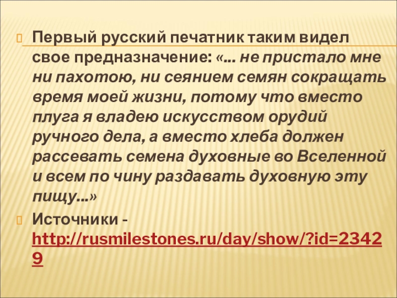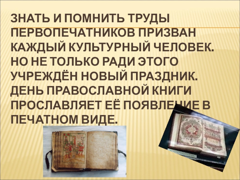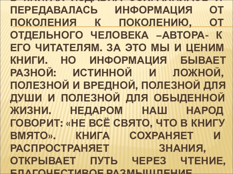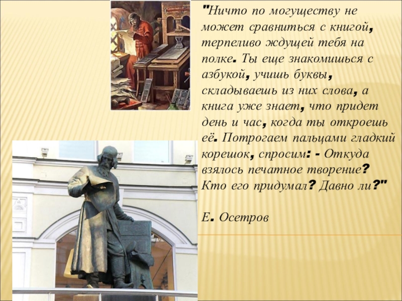 на полке. Ты еще знакомишься с азбукой, учишь буквы, складываешь из них слова, а книга уже знает, что придет день и час, когда ты откроешь её. Потрогаем пальцами гладкий корешок, спросим: - Откуда взялось печатное творение? Кто его придумал? Давно ли?"