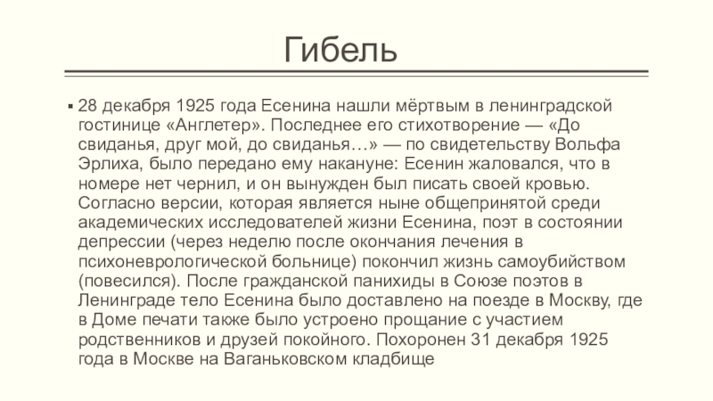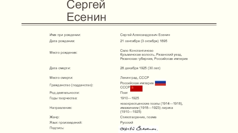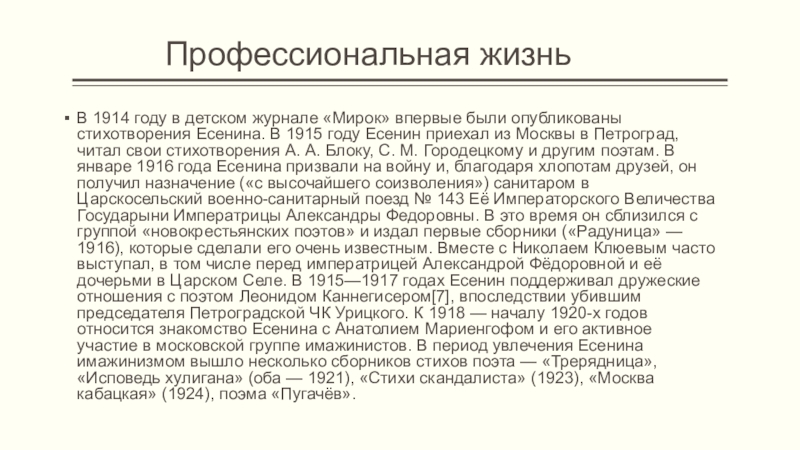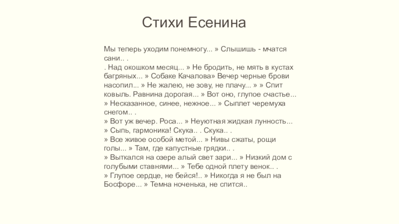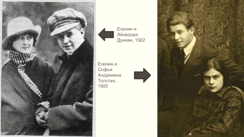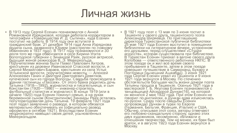 В 1921 году поэт с 13 мая по 3 июня гостил в Ташкенте у своего друга, ташкентского поэта Александра Ширяевца. По приглашению директора Туркестанской публичной библиотеки 25 мая 1921 года Есенин выступил в помещении библиотеки на литературном вечере, устроенном его друзьями, перед слушателями «Студии искусств», которая существовала при библиотеке. В Туркестан Есенин приехал в вагоне своего друга Колобова — ответственного работника НКПС. В этом поезде он и жил всё время своего пребывания в Ташкенте, затем в этом поезде совершил путешествие в Самарканд, Бухару и Полторацк (нынешний Ашхабад). 3 июня 1921 года Сергей Есенин уехал из Ташкента и 9 июня 1921 года вернулся в Москву. По стечению обстоятельств бóльшая часть жизни дочери поэта Татьяны прошла в Ташкенте. Осенью 1921 года в мастерской Г. Б. Якулова Есенин познакомился с танцовщицей Айседорой Дункан[16], на которой он женился 2 мая 1922 года. При этом Есенин не говорил по-английски, а Дункан едва изъяснялась по-русски. Сразу после свадьбы Есенин сопровождал Дункан в турах по Европе (Германия, Бельгия, Франция, Италия) и США. Обычно, описывая этот союз, авторы отмечают его любовно-скандальную сторону, однако этих двух художников, несомненно, сближали и отношения творчества. Тем не менее, их брак был краток, и в августе 1923 года Есенин вернулся в Москву.
