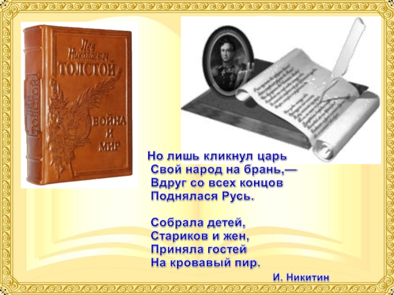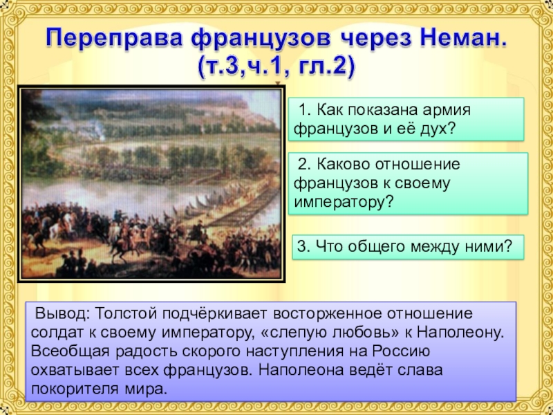 Вывод: Толстой подчёркивает восторженное отношение солдат к своему императору, «слепую любовь» к Наполеону. Всеобщая радость скорого наступления на Россию охватывает всех французов. Наполеона ведёт слава покорителя мира.