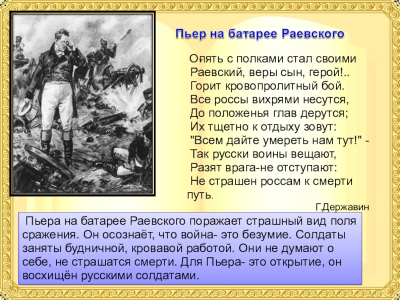 Пьера на батарее Раевского поражает страшный вид поля сражения. Он осознаёт, что война- это безумие. Солдаты заняты будничной, кровавой работой. Они не думают о себе, не страшатся смерти. Для Пьера- это открытие, он восхищён русскими солдатами.