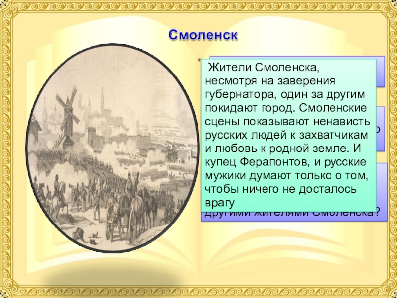 Жители Смоленска, несмотря на заверения губернатора, один за другим покидают город. Смоленские сцены показывают ненависть русских людей к захватчикам и любовь к родной земле. И купец Ферапонтов, и русские мужики думают только о том, чтобы ничего не досталось врагу