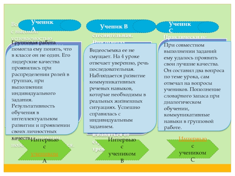 Групповая работа помогла ему понять, что в классе он не один. Его лидерские качества проявились при распределении ролей в группах, при выполнении индивидуального задания. Результативность обучения в интеллектуальном развитии и проявлении своих личностных качеств.
