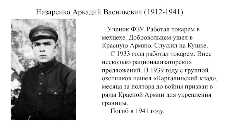 Назаренко Аркадий Васильевич (1912-1941)   Ученик ФЗУ. Работал токарем в мехцехе. Добровольцем ушел в Красную Армию.
