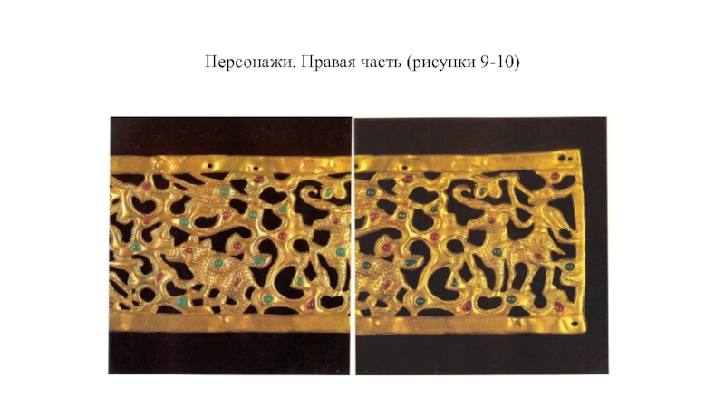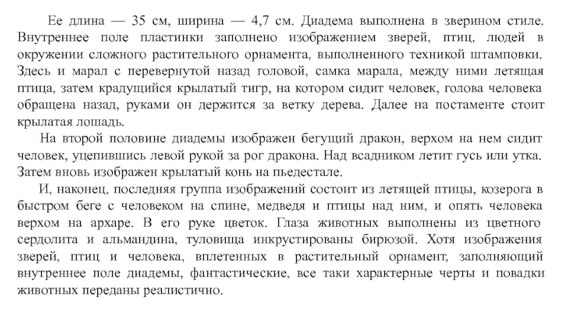 см. Диадема выполнена в зверином стиле. Внутреннее поле пластинки заполнено изображением зверей, птиц, людей в окружении сложного растительного орнамента, выполненного техникой штамповки. Здесь и марал с перевернутой назад головой, самка марала, между ними летящая птица, затем крадущийся крылатый тигр, на котором сидит человек, голова человека обращена назад, руками он держится за ветку дерева. Далее на постаменте стоит крылатая лошадь.