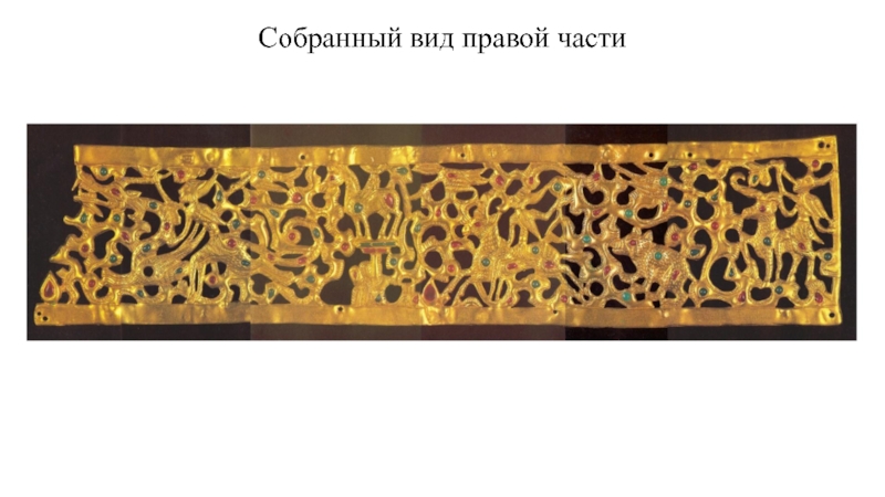 И, наконец, последняя группа изображений состоит из летящей птицы, козерога в быстром беге с человеком на спине, медведя и птицы над ним, и опять человека верхом на архаре. В его руке цветок. Глаза животных выполнены из цветного сердолита и альмандина, туловища инкрустированы бирюзой. Хотя изображения зверей, птиц и человека, вплетенных в растительный орнамент, заполняющий внутреннее поле диадемы, фантастические, все таки характерные черты и повадки животных переданы реалистично.