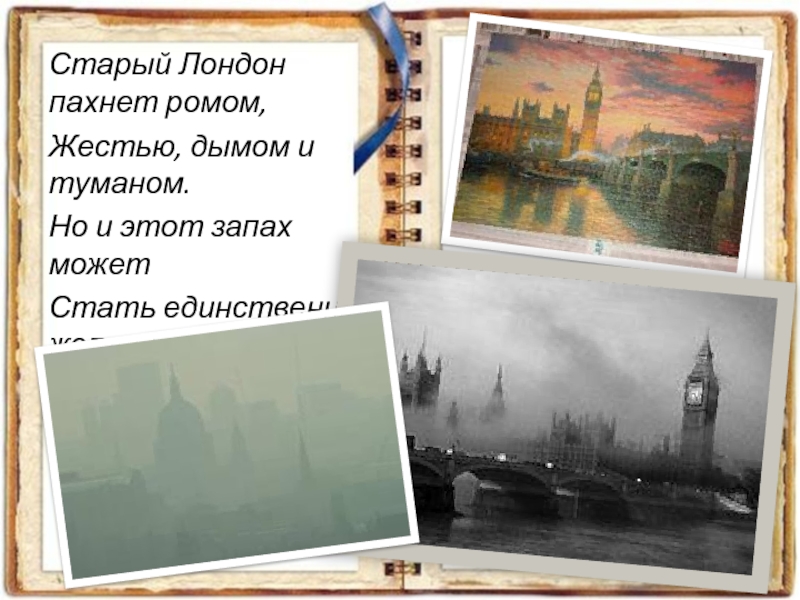 Старый Лондон пахнет ромом,Жестью, дымом и туманом.Но и этот запах можетСтать единственно желанным..
