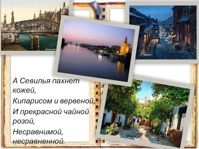А Севилья пахнет кожей,Кипарисом и вервеной,И прекрасной чайной розой,Несравнимой, несравненной.