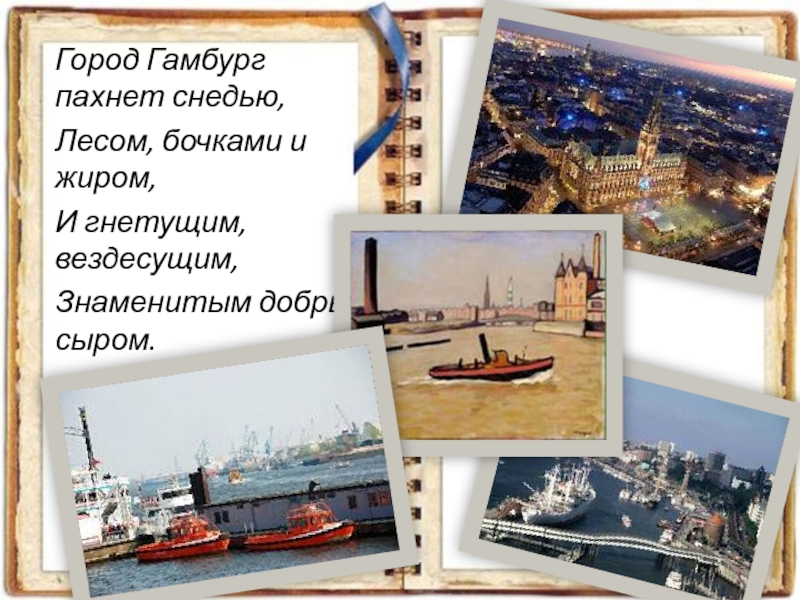 Город Гамбург пахнет снедью,Лесом, бочками и жиром,И гнетущим, вездесущим,Знаменитым добрым сыром.