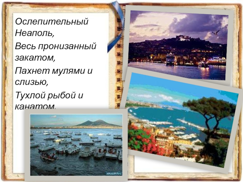 Ослепительный Неаполь,Весь пронизанный закатом,Пахнет мулями и слизью,Тухлой рыбой и канатом.