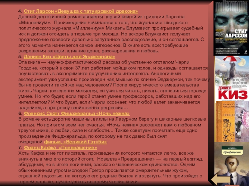 из трилогии Ларсона «Миллениум». Произведение начинается с того, что журналист шведского политического журнала «Миллениум» Микаэль Блумквист проигрывает судебный иск и должен отсидеть в тюрьме три месяца. Но вскоре Блумквист получает предложение провести довольно запутанное расследование, и он соглашается. С этого момента начинается самое интересное. В книге есть все: требующие разрешения загадки, влияние денег, разочарования и любовь.