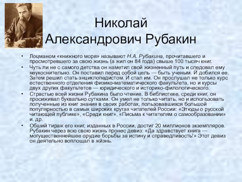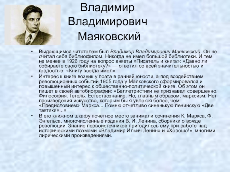 Выдающимся читателем был Владимир Владимирович Маяковский. Он не считал себя библиофилом. Никогда не имел большой библиотеки. И тем не менее в 1926 году на вопрос анкеты «Писатель и книга»: «Давно ли собираете свою библиотеку?» — ответил со всей значительностью и гордостью: «Книгу всегда имел».