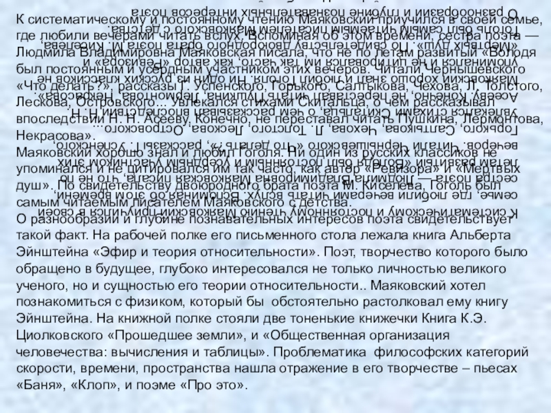 О разнообразии и глубине познавательных интересов поэта свидетельствует такой факт. На рабочей полке его письменного стола лежала книга Альберта Эйнштейна «Эфир и теория относительности». Поэт, творчество которого было обращено в будущее, глубоко интересовался не только личностью великого ученого, но и сущностью его теории относительности.. Маяковский хотел познакомиться с физиком, который бы обстоятельно растолковал ему книгу Эйнштейна. На книжной полке стояли две тоненькие книжечки Книга К.Э. Циолковского «Прошедшее земли», и «Общественная организация человечества: вычисления и таблицы». Проблематика философских категорий скорости, времени, пространства нашла отражение в его творчестве – пьесах «Баня», «Клоп», и поэме «Про это».
