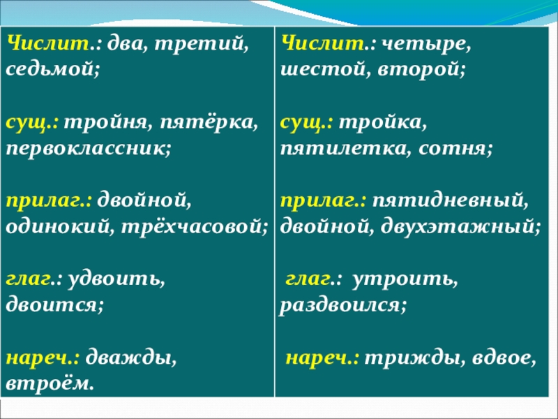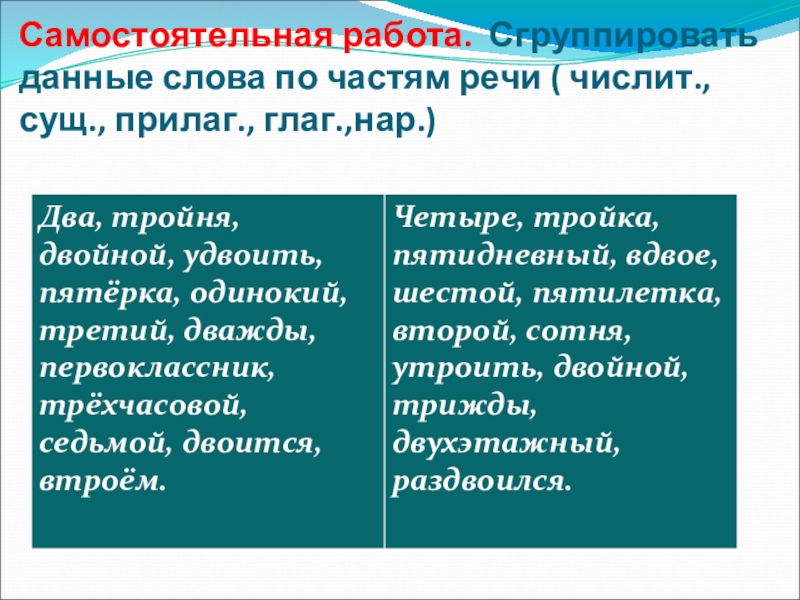 Слайд 4 Самостоятельная работа. Сгруппировать данные слова по частям речи ( числит., сущ.,