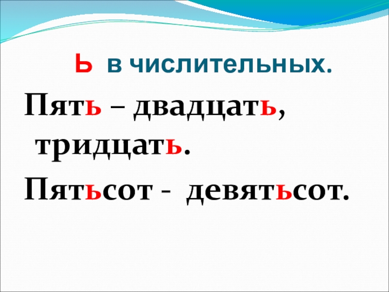 Ь в числительных.Пять – двадцать, тридцать.Пятьсот - девятьсот.