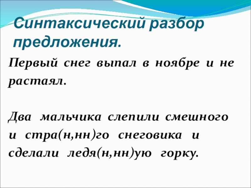 Синтаксический разбор предложения.Первый снег выпал в ноябре и нерастаял. Два  мальчика слепили смешногои  стра(н,нн)го