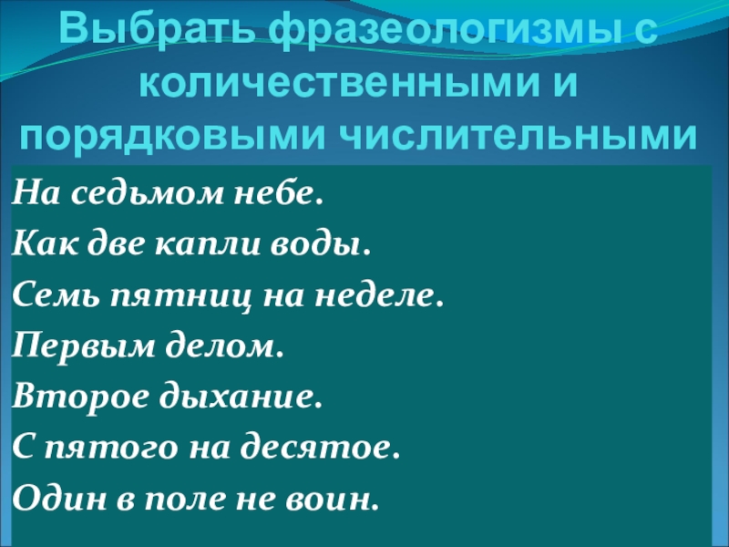 Слайд 20Выбрать фразеологизмы с количественными и порядковыми числительными