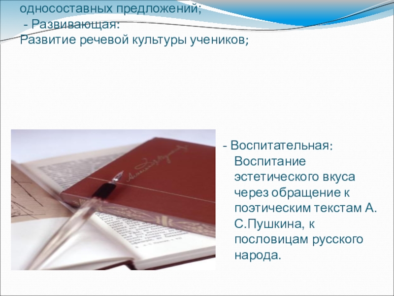 - Воспитательная: Воспитание эстетического вкуса через обращение к поэтическим текстам А.С.Пушкина, к пословицам русского народа.
