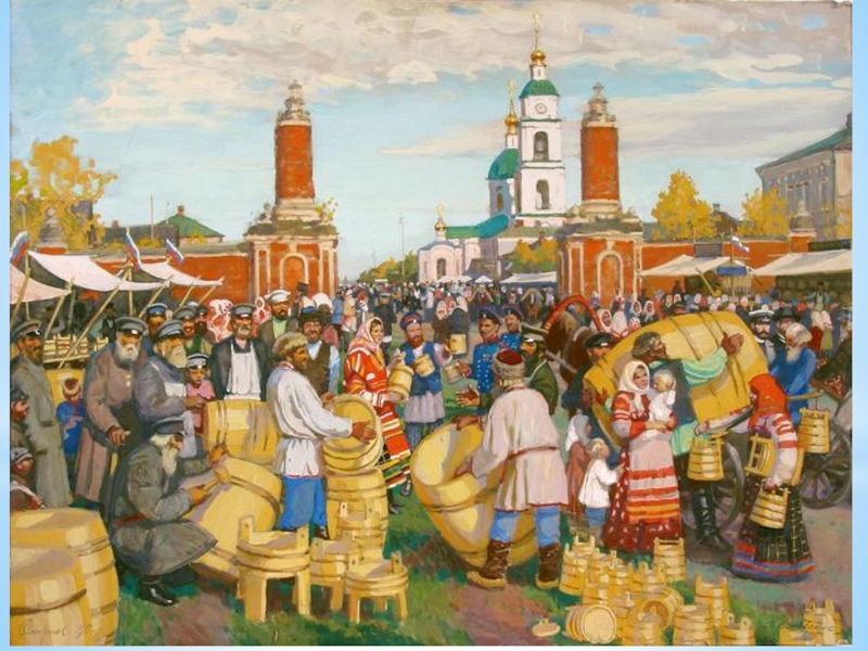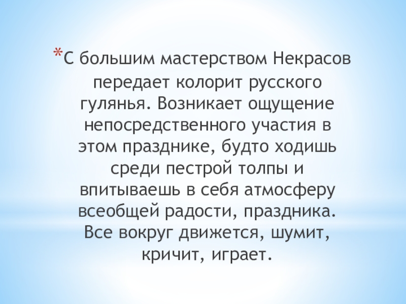 Слайд 15С большим мастерством Некрасов передает колорит русского гулянья. Возникает ощущение непосредственного