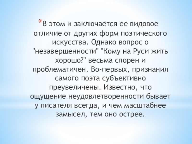 искусства. Однако вопрос о "незавершенности" "Кому на Руси жить хорошо?" весьма спорен и проблематичен. Во-первых, признания самого поэта субъективно преувеличены. Известно, что ощущение неудовлетворенности бывает у писателя всегда, и чем масштабнее замысел, тем оно острее.